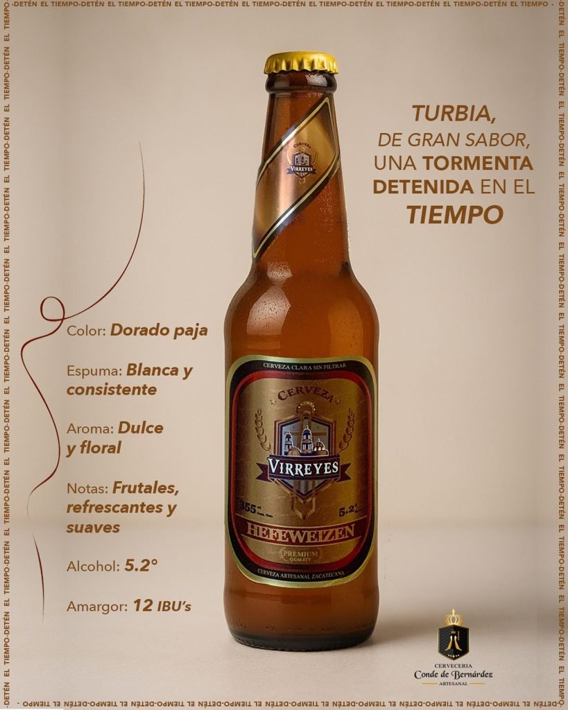 - “Turbia, de gran sabor, una tormenta detenida en el tiempo”. Elaborada a base de malta de cebada y trigo es una cerveza refrescante y suave; turbia, dentro de los tonos dorados, característico de este estilo alemán; con marcados aromas florales y notas afrutadas al paladar.
