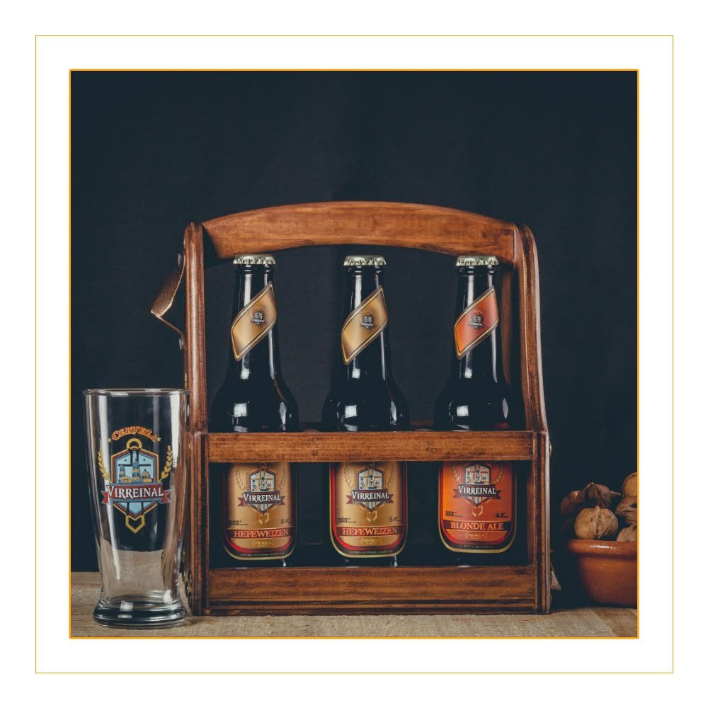 Caja artesanal de madera de 6 piezas que con destapador y logotipos metálicos. Incluye 6 de nuestras cervezas y se puede personalizar con el nombre considerando un tiempo adicional de entrega de 3 semanas.